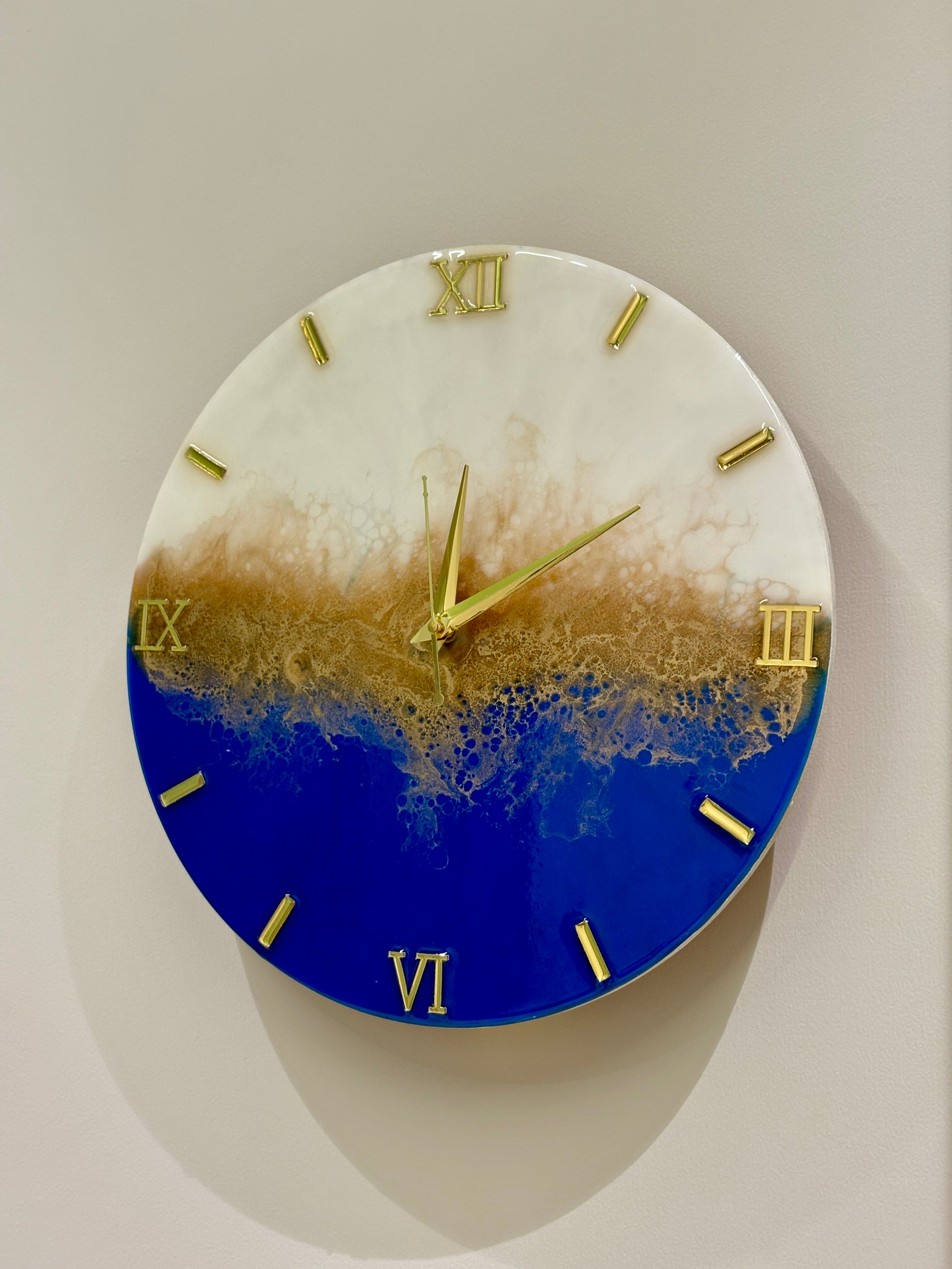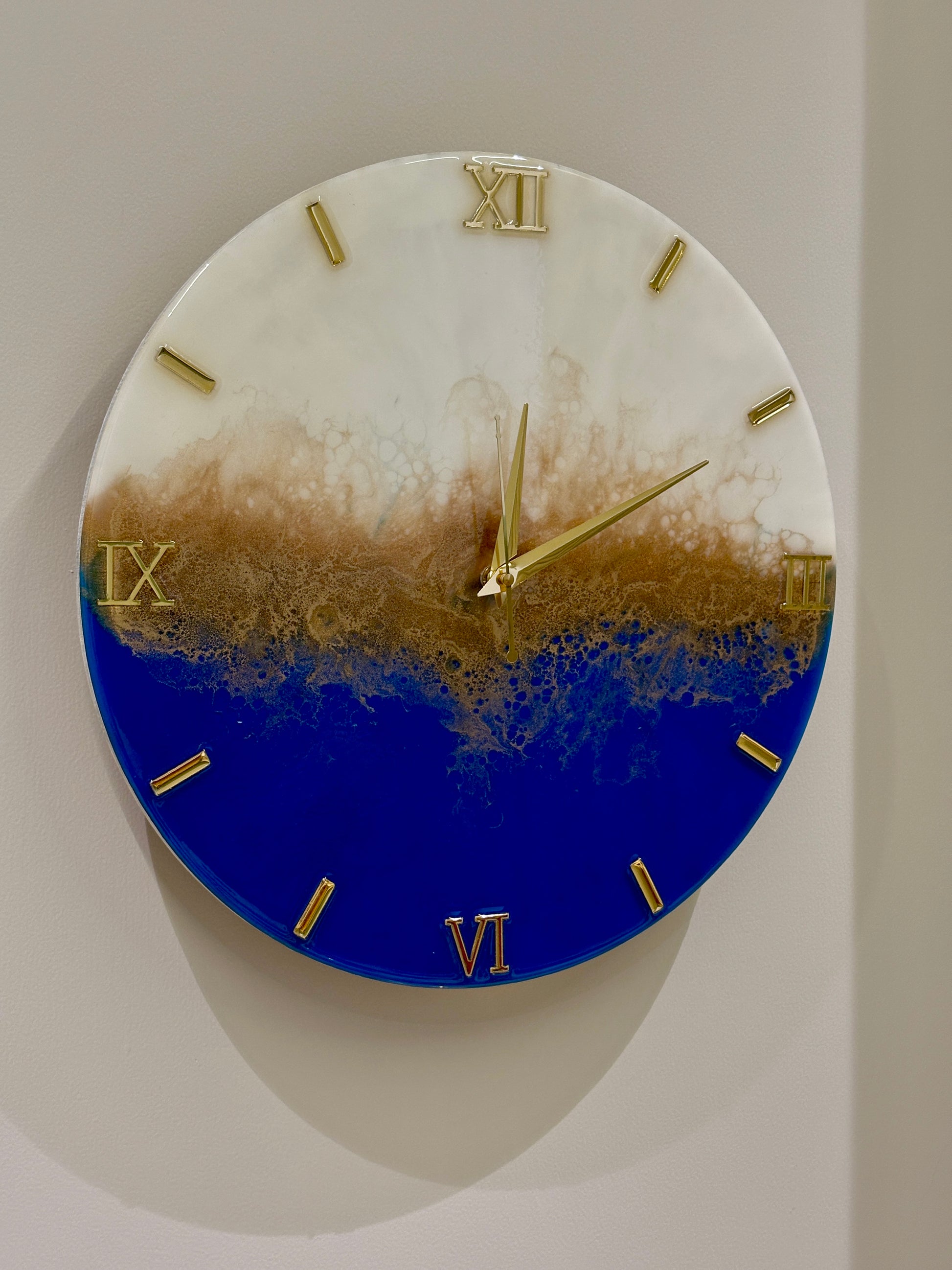Meticulously poured with layers of rich cobalt blue, shimmering gold, and soft ivory white, this clock evokes the tranquil essence of a beach shoreline frozen in time. The flowing textures and lustrous finish make every piece truly one-of-a-kind, offering a sophisticated blend of art and functionality.