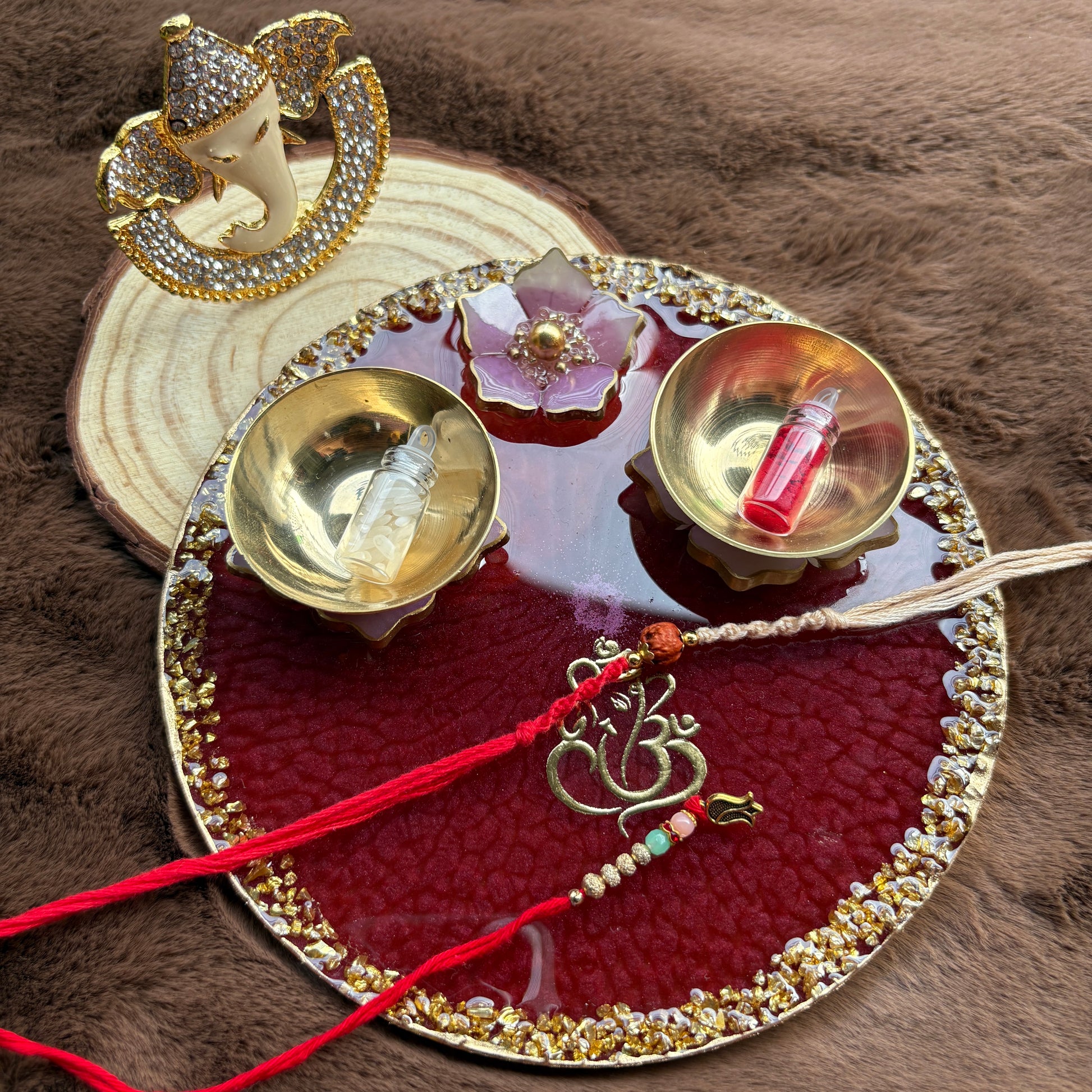 Elevate your rituals with this handcrafted Resin Tilak Plate, a perfect blend of tradition and elegance. Featuring a beautifully detailed gold-toned Ganesha idol, dual brass diya bowls, and a stunning maroon resin base with crystal embellishments, this thali is designed to add grace to every auspicious occasion.