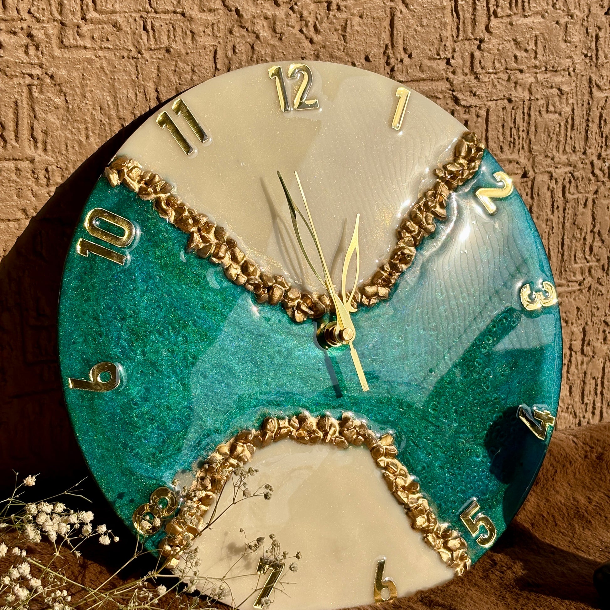 Elevate your space with the timeless beauty of the Aqua Aura Resin Clock, a true masterpiece inspired by the tranquil blend of ocean waves and golden shores. Handcrafted with precision, this clock features a stunning fusion of deep emerald green resin, shimmering gold accents, and soft ivory tones, bringing a sense of luxury and serenity to any room.