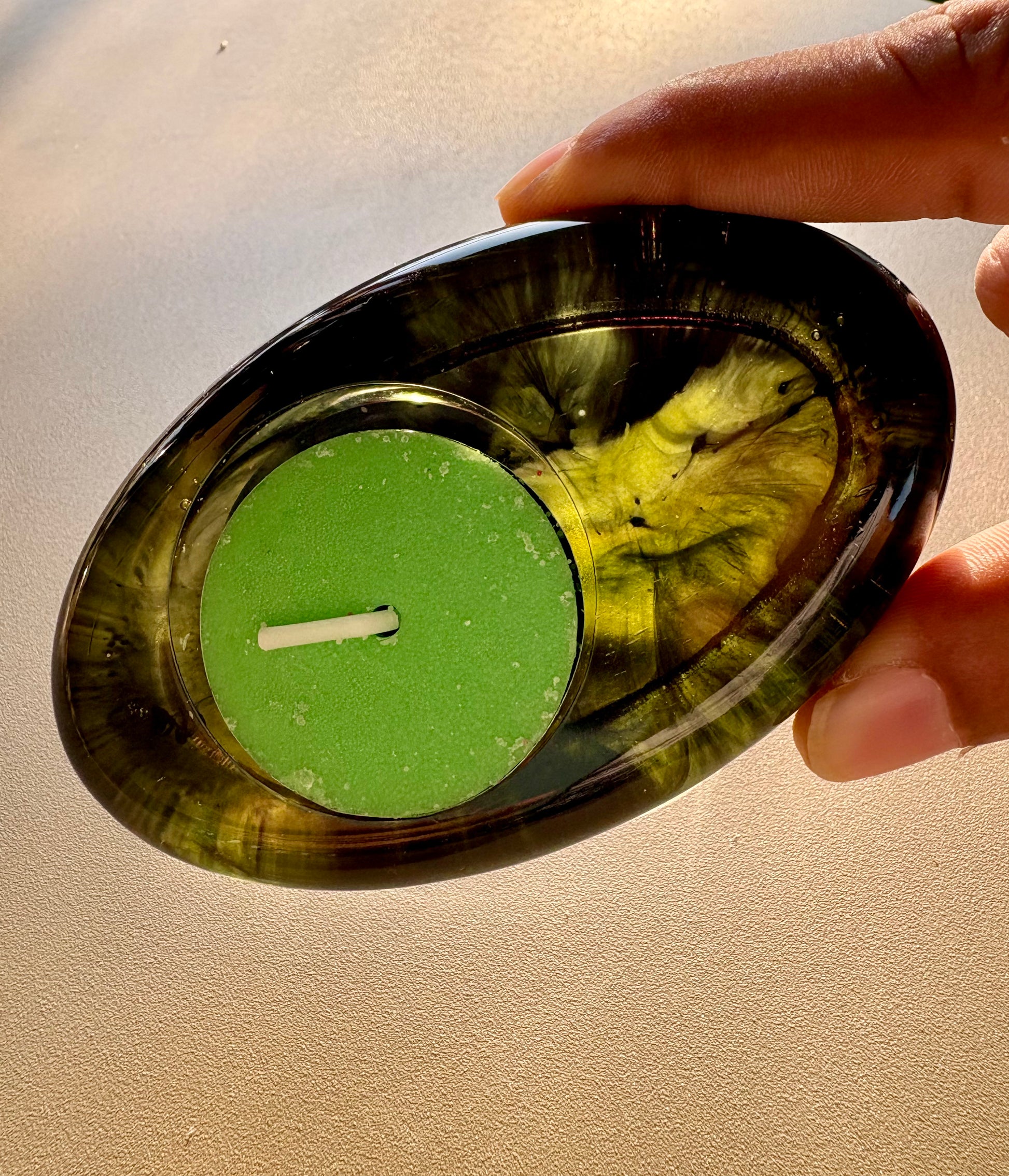 Add a touch of sophistication to your space with the Flame Petal T-Light Candle Holder. This oval-shaped holder is crafted with a translucent resin base, showcasing a mesmerizing flame-inspired pattern in earthy hues. The green T-light candle creates a stunning contrast, casting a warm and tranquil glow. Ideal for festive occasions, intimate evenings, or as a unique gift, this piece is a harmonious blend of art and functionality.