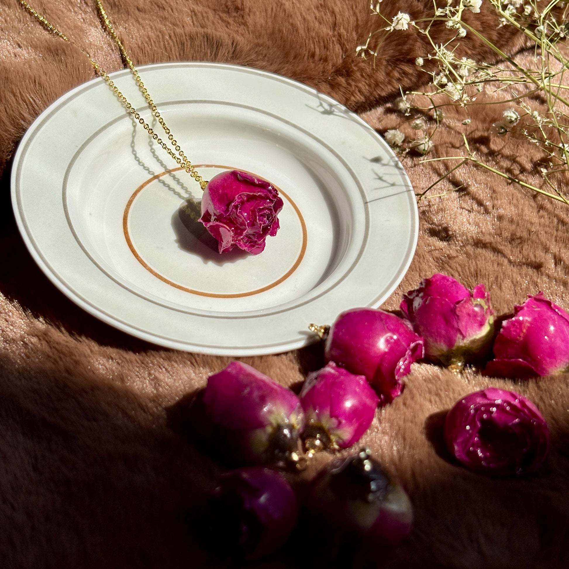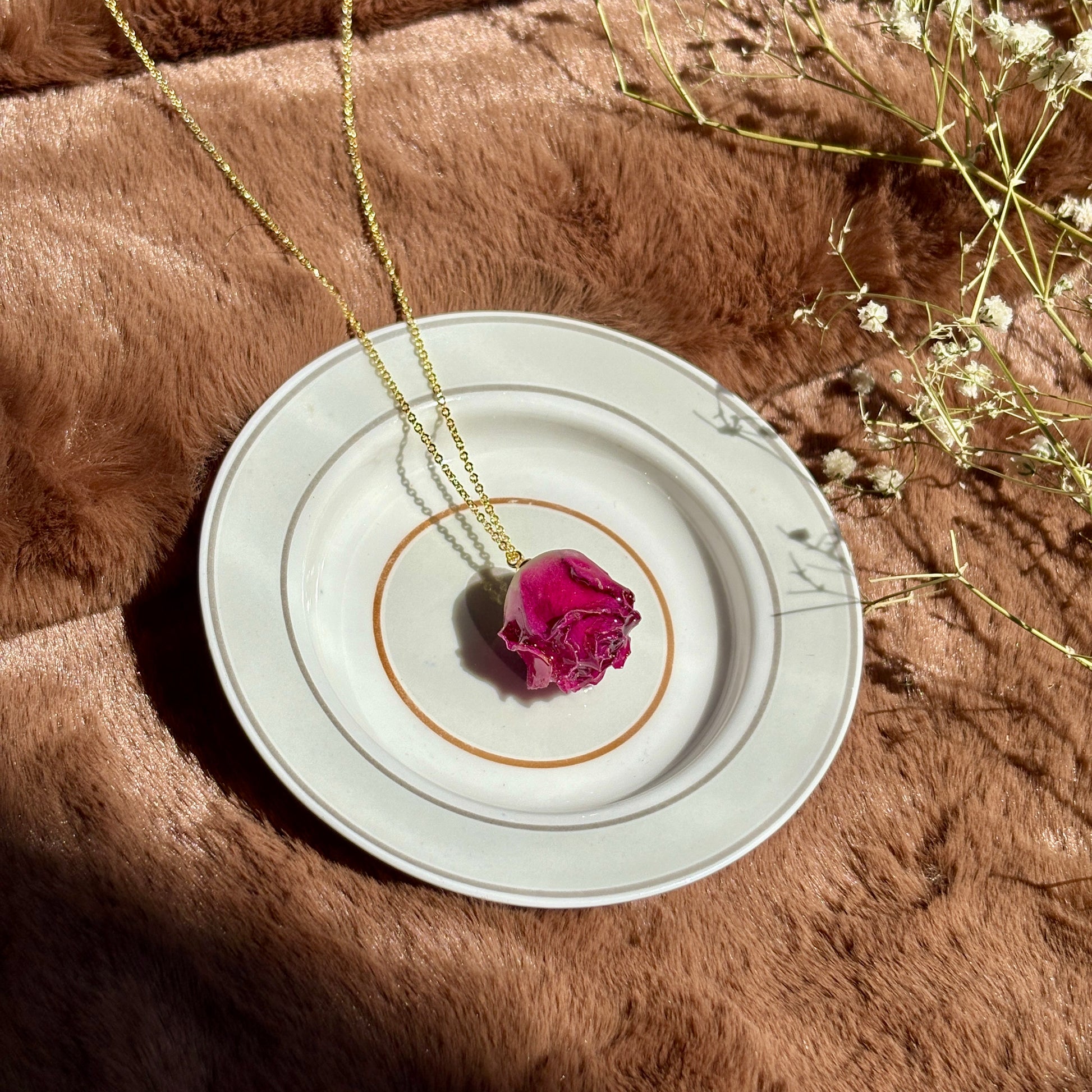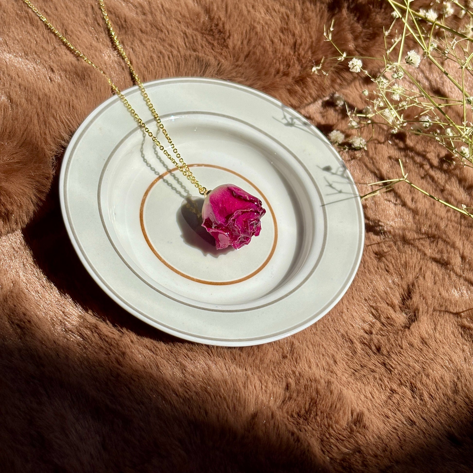 Each pendant features a real rosebud, carefully preserved in crystal-clear resin to lock in its color, shape, and sentiment forever. Suspended from a sleek, high-quality gold-plated chain, this necklace is more than just jewelry — it’s a piece of art inspired by nature and romance.